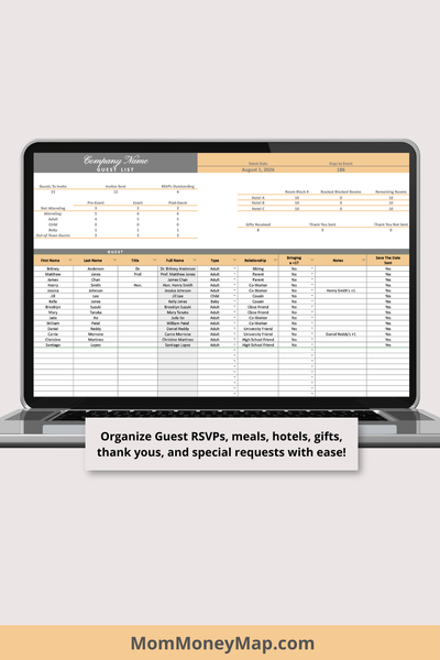 4. Event Guest List Tracker (tracks contact information for up to 950 guests, invite and RSVP status, event attendance, requested meals, hotel accommodations, gifts, thank you cards etc.)