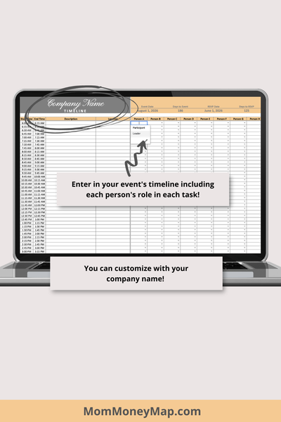7. Event Timeline (where you can enter your event timeline, tasks, the key people involved and whether they're participating or leading the task)