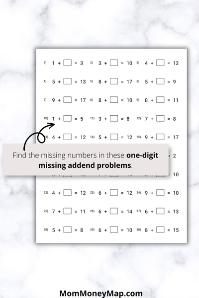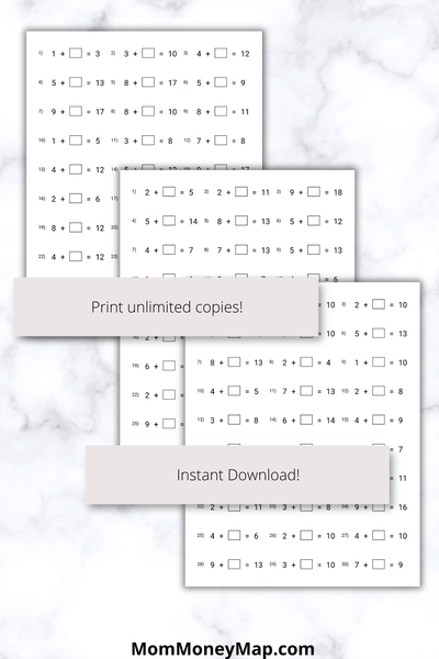 Build strong early math skills with this 100-page missing addend worksheets printable PDF designed for 1 digit + 1 digit addition practice.