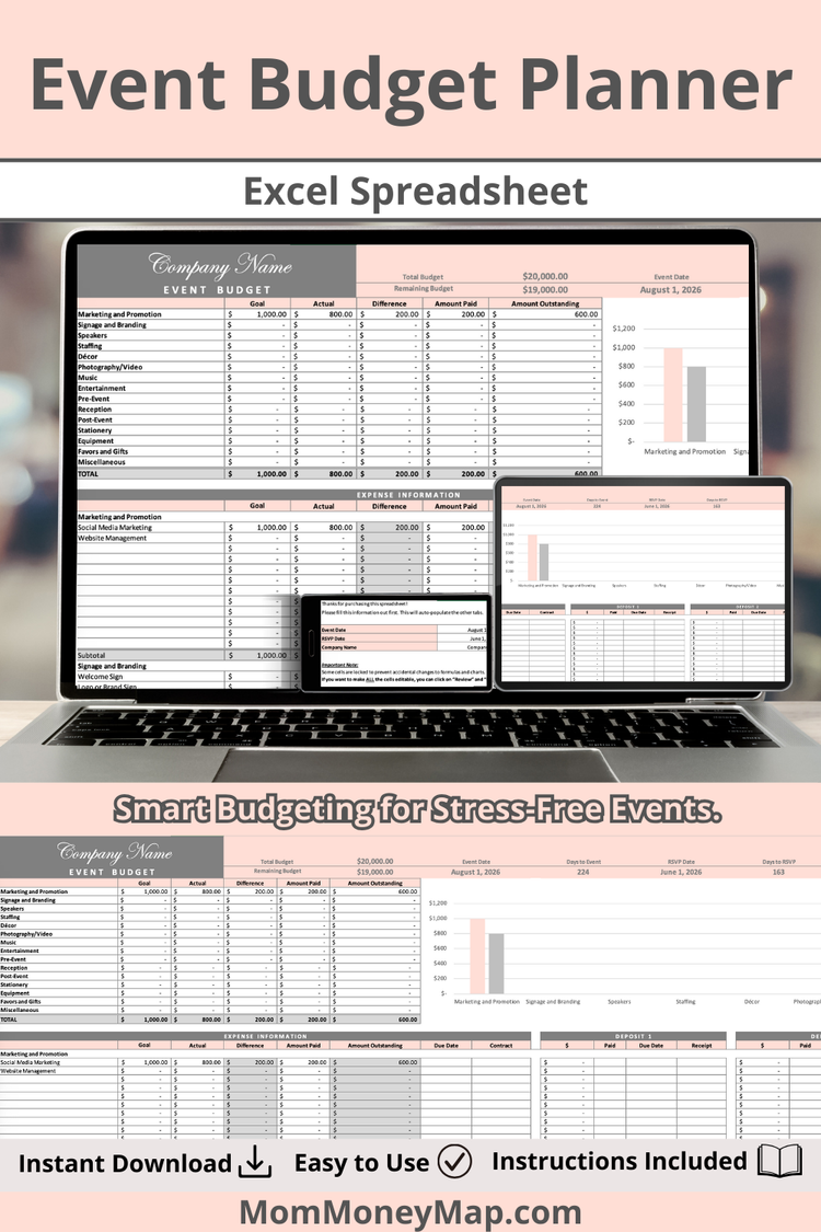 Stay on budget and plan your event with confidence using this Event Budget Planner Excel Spreadsheet. Designed to help you track estimated vs. actual costs, this planner keeps all event expenses organized in one simple, easy-to-use spreadsheet.