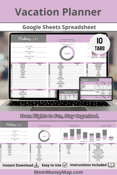 Featuring a clean purple aesthetic design, this digital vacation planner works seamlessly in Google Sheets and is available as an instant download — perfect for stress-free vacation planning.