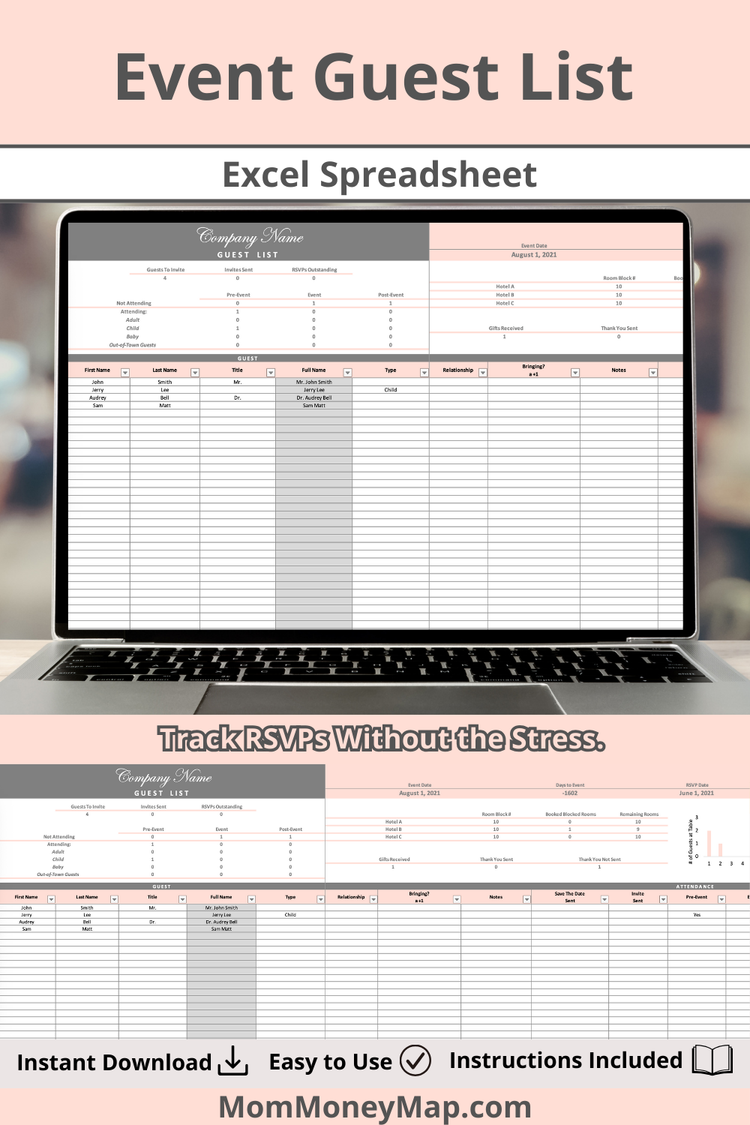 Keep your event organized and stress-free with this Event Guest List Excel Spreadsheet. Designed to help you track guests, RSVPs, attendance, and notes all in one place, this spreadsheet makes managing your guest list simple and efficient.