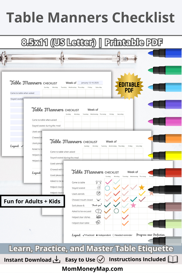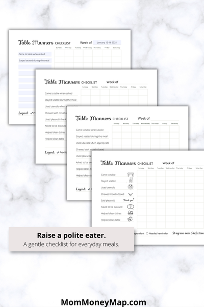 You can print unlimited copies of these table manners checklist and there are detailed instructions with tips on how to save and make more money.
