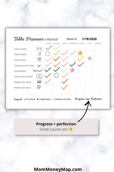While making mealtime expectations clear and easy, this printable checklist encourages polite habits, independence, and confidence at the table.