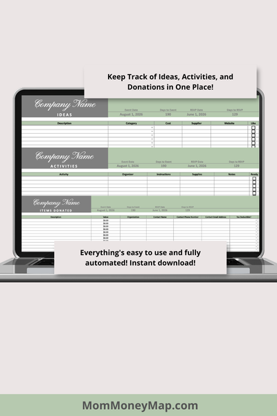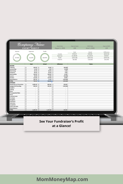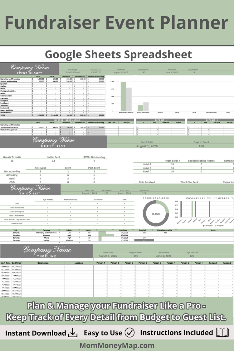 Plan, organize, and track your fundraising event with this easy-to-use Sage Green Fundraiser Google Sheets Spreadsheet.